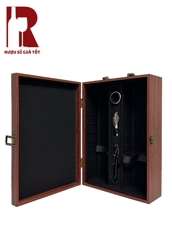 Hộp Gỗ Đựng Rượu Phối Da Hai Chai Có Phụ Kiện có giá 250.000 VNĐ, là lựa chọn hợp lý để bảo vệ rượu, nâng giá trị quà tặng và tiện lợi cho việc trưng bày hoặc biếu tặng.