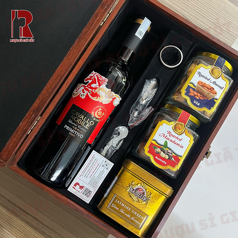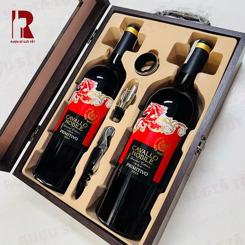 Phần quan trọng nhất của hộp quà chắc chắn là chất lượng rượu bên trong. Bộ này sử dụng dòng Cavallo Nobile Primitivo Limited Edition, một loại vang đỏ đến từ miền Nam nước Ý – nơi nổi tiếng với khí hậu ấm áp rất phù hợp cho giống nho Primitivo.